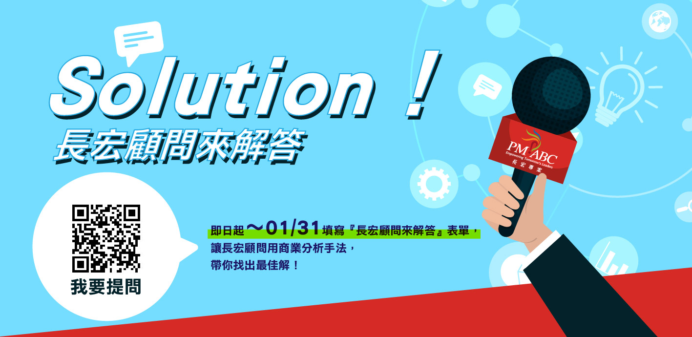長宏顧問不忘初衷且秉持專業,在新年之際推出『長宏顧問來解答』活動,邀請實力堅強的長宏講師團隊,運用商業分析手法,帶你幫公司的疑難雜症找出最佳解!