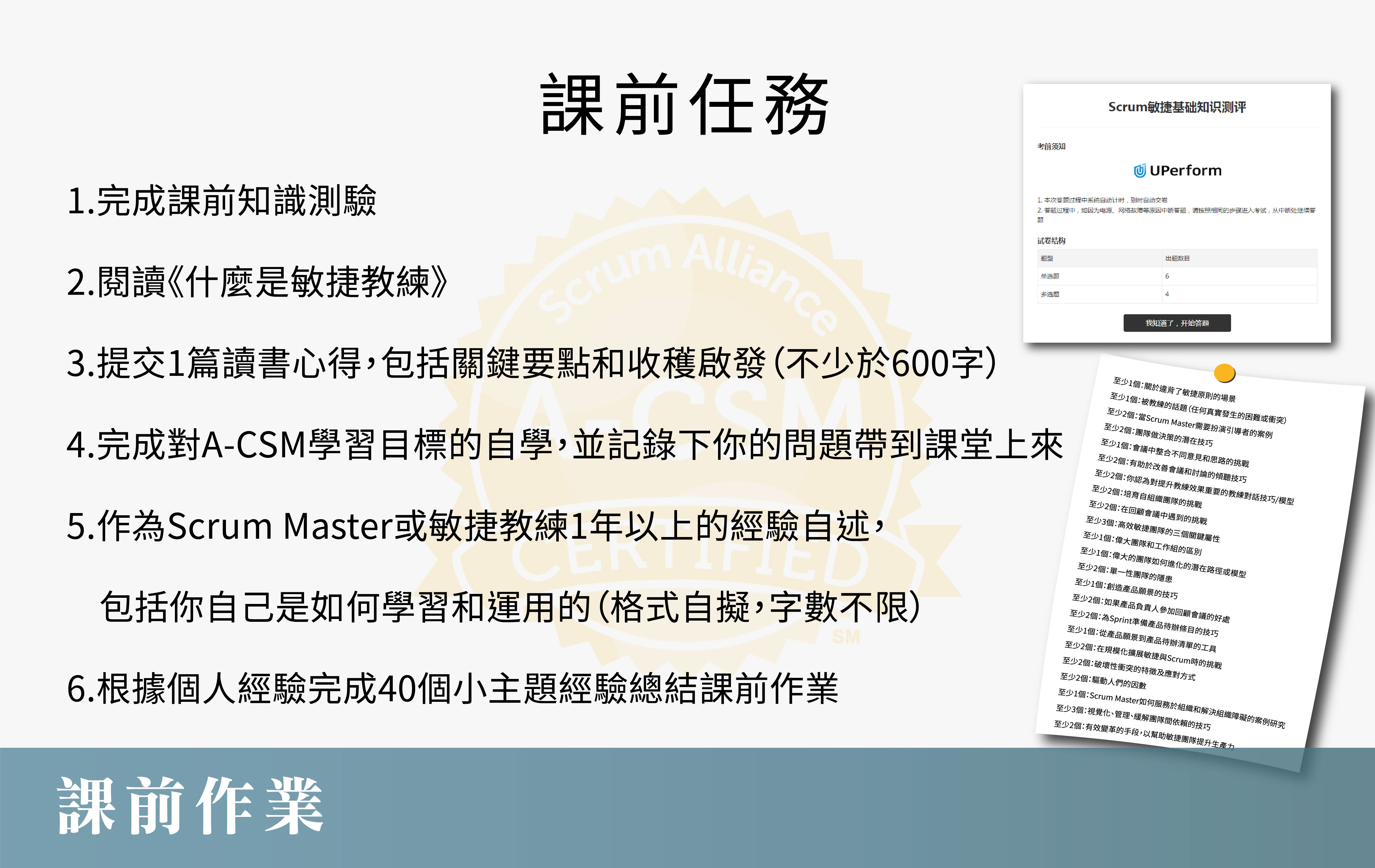 - A-CSM課程無需考試,但須完成作業才能獲得認證
