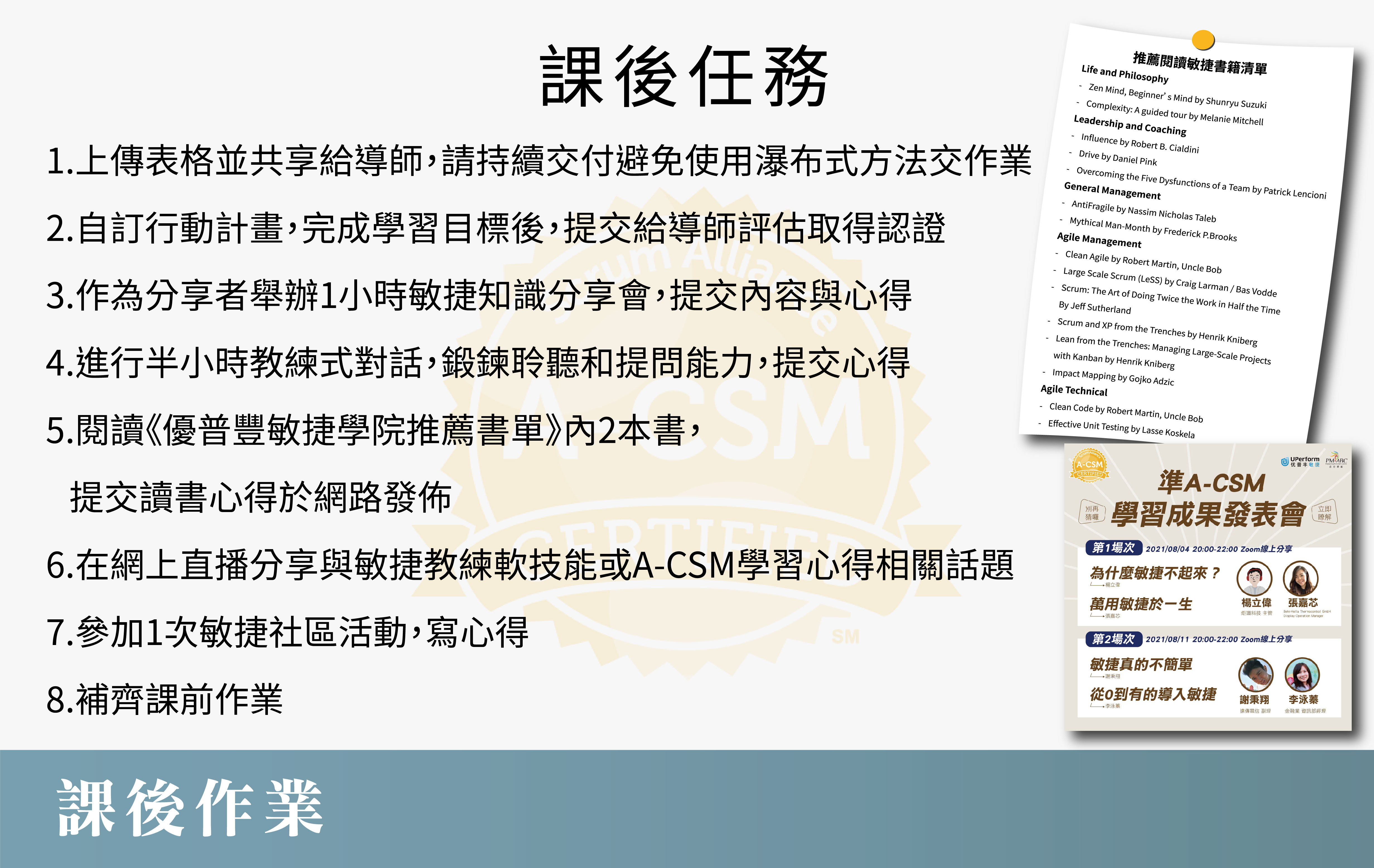 - 課程教材:提供敏捷教練必讀書籍,讓學習者一步一步取得A-CSM國際證照