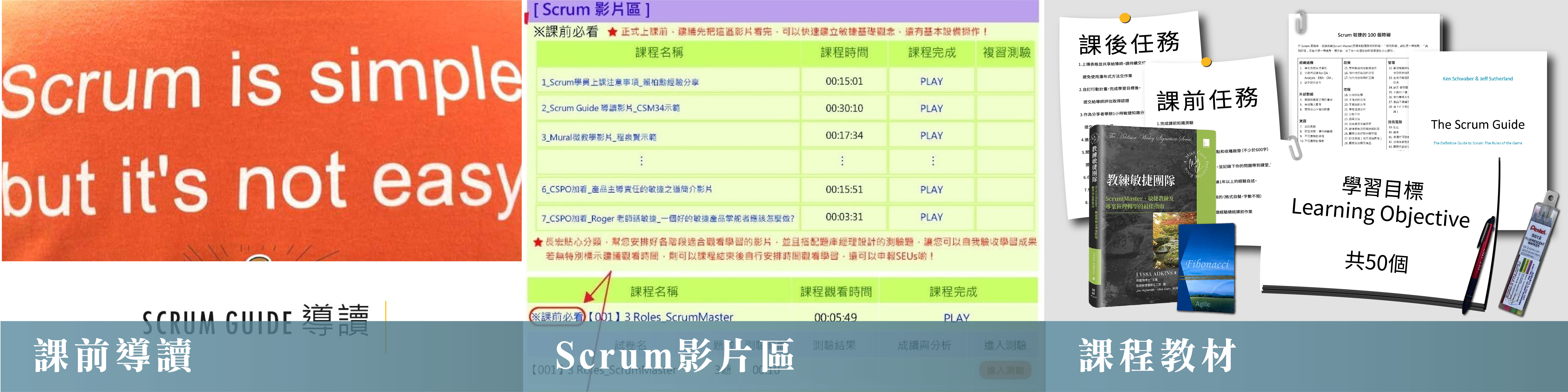 - Scrum影片區: 課前預習/課中補強/課後學習三階段影片,能針對不同需要來效強化課程吸收